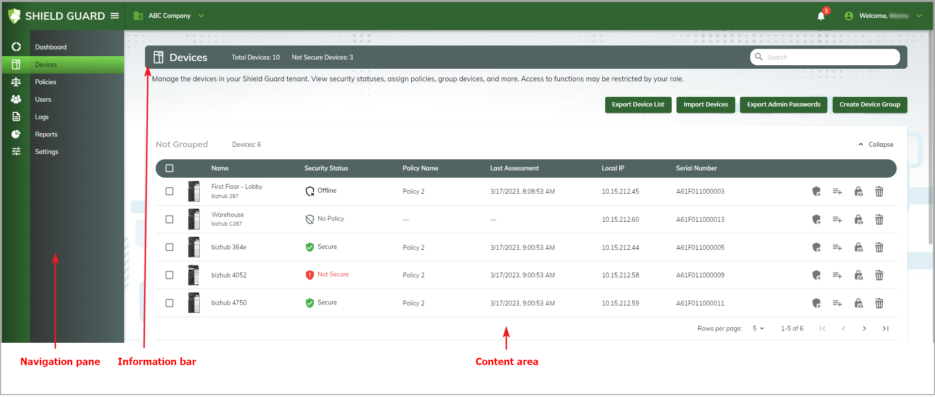The following illustration shows the Devices page: